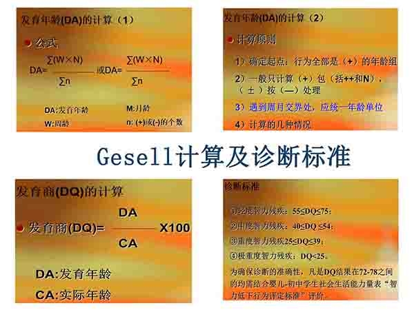 格賽爾(Gesell)智能診斷法適用于嬰幼兒。這種方法 從動作能、應(yīng)物能、言語能及應(yīng)人能4個方面進(jìn)行檢查,并把4周、16周、28周、40周、52周、18個月、24個月、36個月作為8個“樞紐年齡”,即 在這些階段顯示出特殊飛躍進(jìn)展。所測得的結(jié)果,以發(fā)育商數(shù)(DQ)來表示。