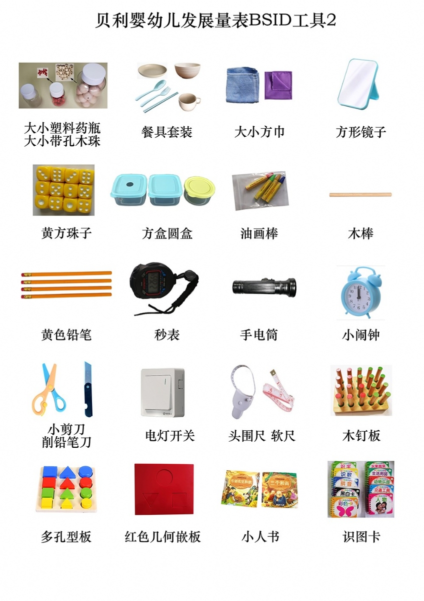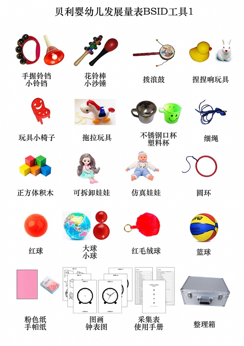 手握鈴鐺、小鈴鐺、花鈴棒、撥浪鼓、小沙錘、捏捏響玩具、玩具小椅子、拖拉玩具(帶線)、小正方體積木(紅12個(gè),黃藍(lán)綠各2塊)、可拆卸娃娃、布娃娃、圓環(huán)、紅球、大球、紅毛絨球、籃球、紅色小球、細(xì)繩、不銹鋼口杯、塑料杯、大號(hào)塑料藥瓶、小號(hào)塑料藥瓶、餐具套裝、大小方巾、方形鏡子、大木珠(帶孔)、小木珠(帶孔、)黃方珠子、塑料方盒、塑料圓盒、油畫棒、指揮棒、黃色鉛筆、秒表、手電筒、小鬧鐘、電燈開關(guān)、頭圍尺、軟尺、木釘板、多孔型板(含圓形、方形、三角形各4塊)、幾何嵌板(含圓、三角、方形,厚8mm)、小人書識(shí)圖卡(果蔬、人物、動(dòng)物、交通等)、粉色卡紙、手帕紙、鐘表圖1234、圖畫12(BSID)、BSID采集表、BSID使用手冊(cè)、整理箱等。