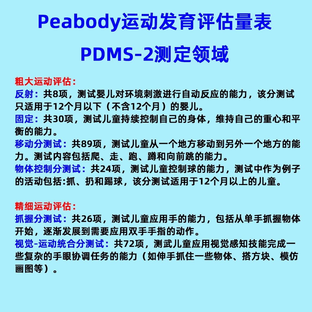 (1)測(cè)驗(yàn)范圍:適用于5個(gè)月-16歲兒童的運(yùn)動(dòng)能力。